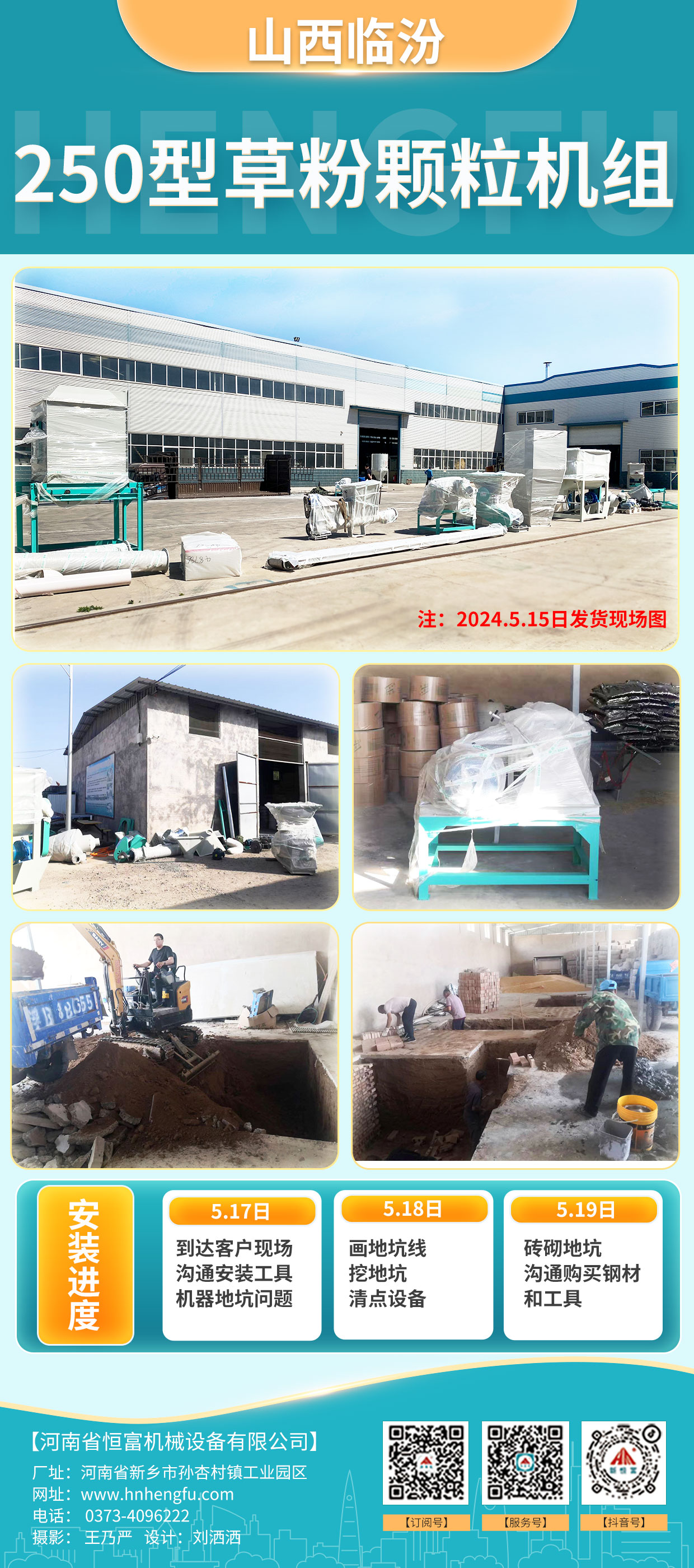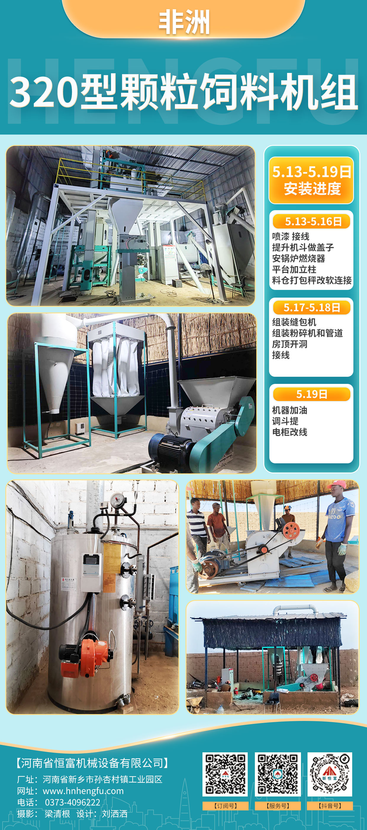 正在安裝的設備:非洲320型顆粒飼料機組、山西臨汾250型草(cǎo)粉顆粒機(jī)組。