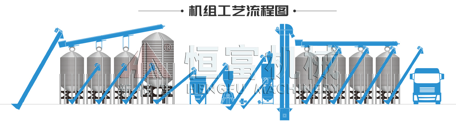 前端搭配4個原料塔,分別儲存玉米、小麥、豆粕、麩皮;把需要粉碎的物(wù)料先進行稱重(chóng)和搭配,然後(hòu)一(yī)起進水滴型飼料(liào)粉(fěn)碎機進行粉碎,之後再進單軸螺(luó)帶飼料混合機進行混合,混合完成的飼料(liào)進料(liào)塔(tǎ)暫存,後續連接撒料車,直接進行飼喂。