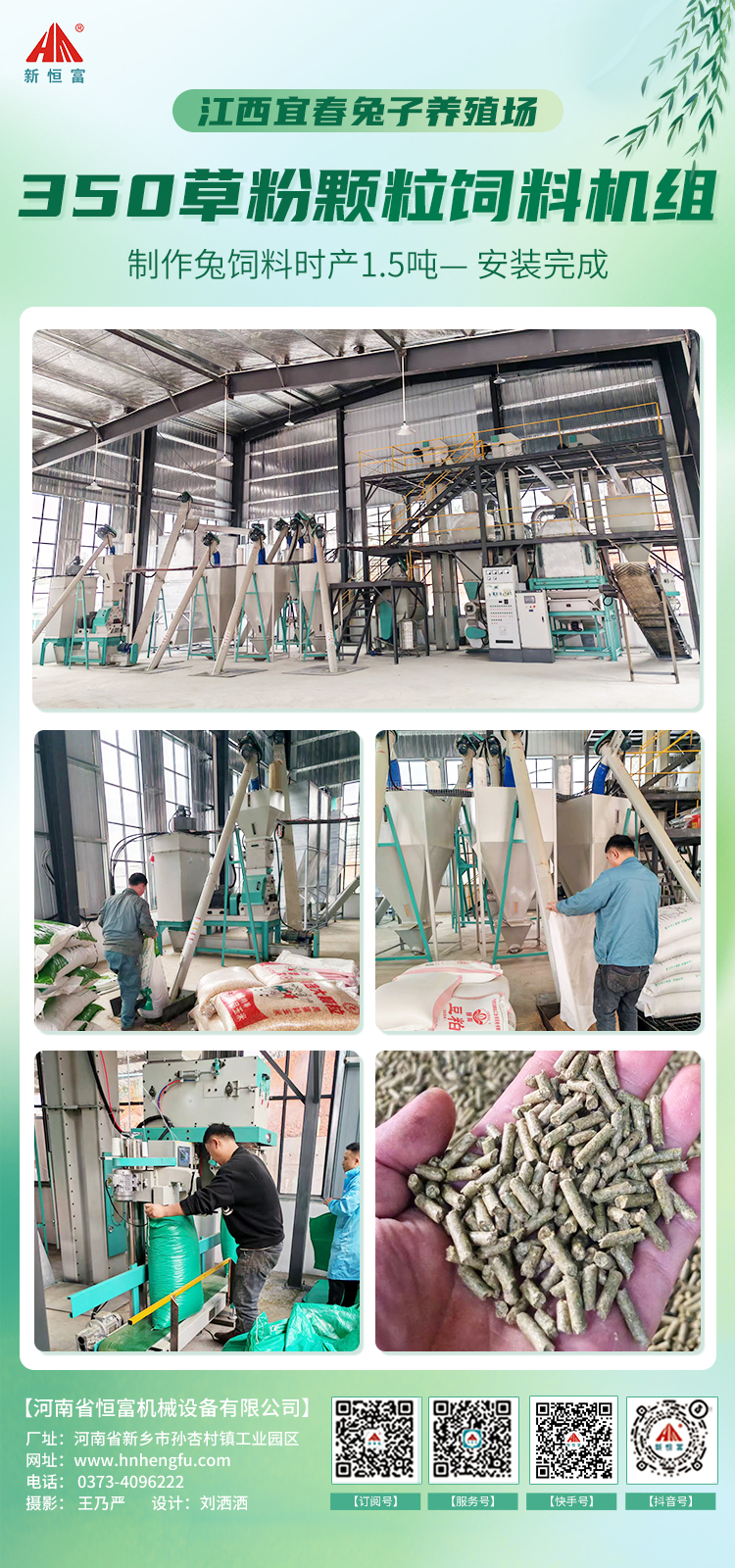 江西宜春兔(tù)子養殖場,時產1.5噸草粉顆粒飼料加工機組安(ān)裝(zhuāng)完成。