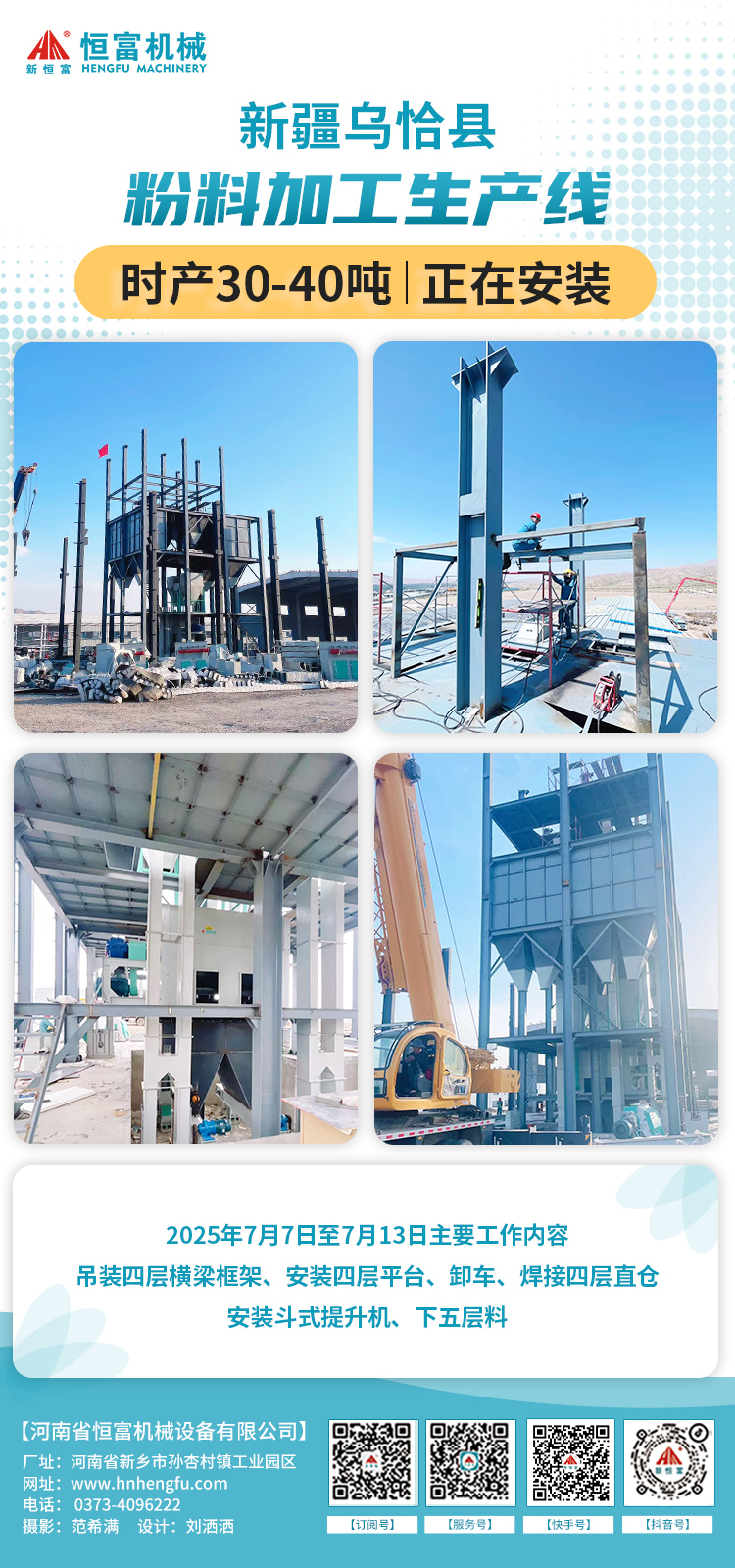 2025年7月7日至7月13日(rì)主要工作內容:吊四層(céng)橫梁,焊接橫梁,焊接四層骨架,卸車(chē),焊分配器支(zhī)架,8立方倉,組(zǔ)裝鬥式提升機,焊接(jiē)料倉錐(zhuī)度,吊裝,下五層料等。