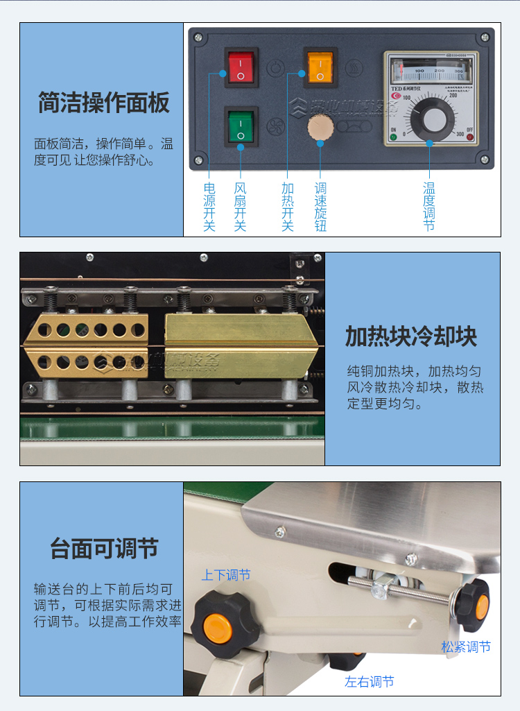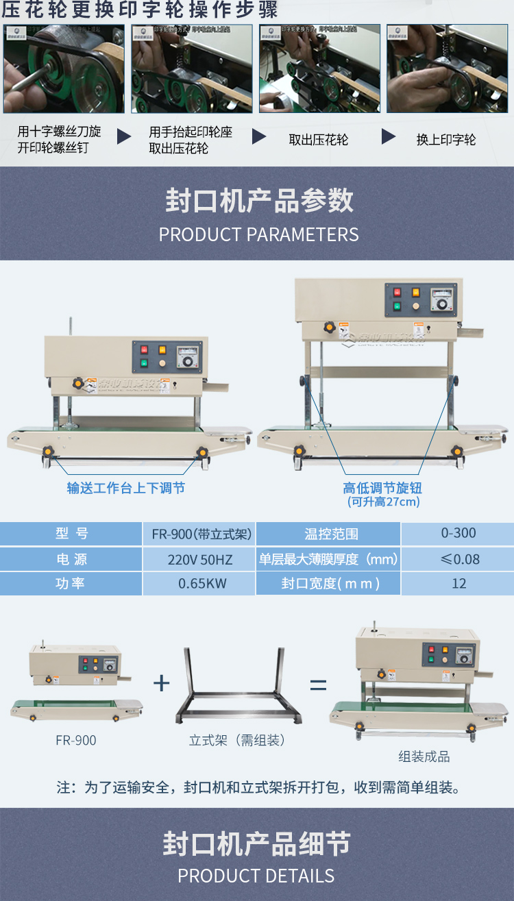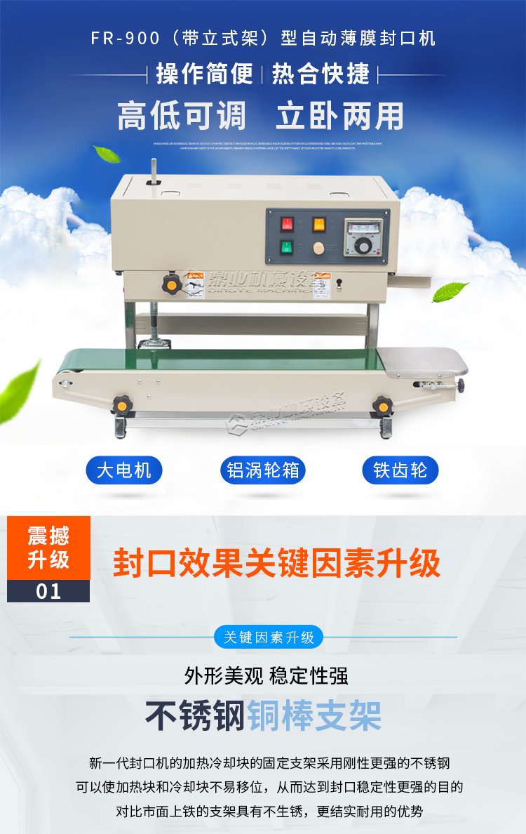 FR-900V型自動薄膜(mó)封(fēng)口機采用(yòng)電子恒溫控製和無極調速的傳動機構,可封製(zhì)各種不同材料的塑料包裝(zhuāng)袋,由於本機器體積小,應用廣泛,封口長度不受限製,所以可與各種包裝流水線配套使用。它將是工廠,商店批量產品包裝的封口設備。