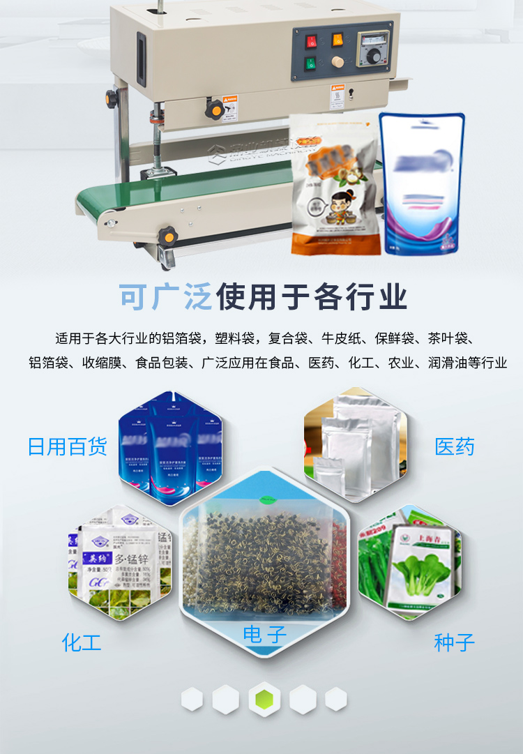 本機使(shǐ)用於塑料薄膜(mó)的(de)封口、製袋,可廣泛應用在食品、醫(yī)藥(yào)、化工、日用、種子等行(háng)業。