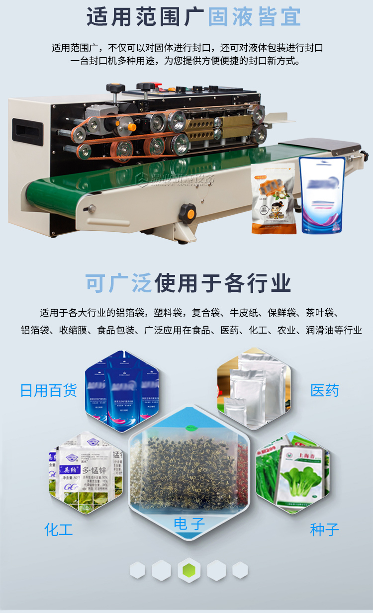 該機可廣泛適用於:食品、土特產、茶葉、化妝品、醫藥、乳品、飲料、化工、電子、小五金等行(háng)業。