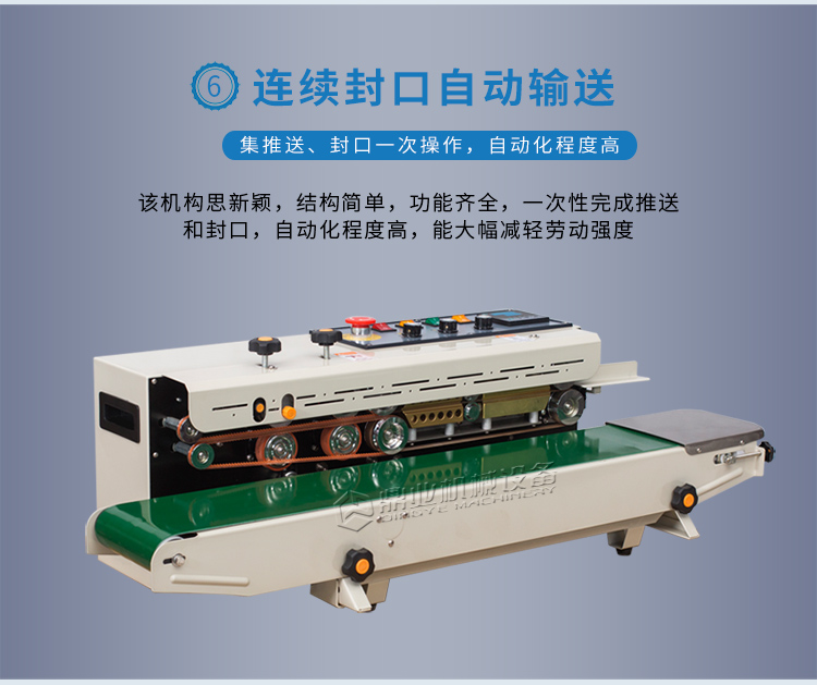 該機(jī)具有(yǒu)連續輸送、封口(kǒu)、油墨印製標簽(出廠日期、生產批號(hào)等)一次(cì)完成之功效,可封合印製任何一種可熱性的薄膜。