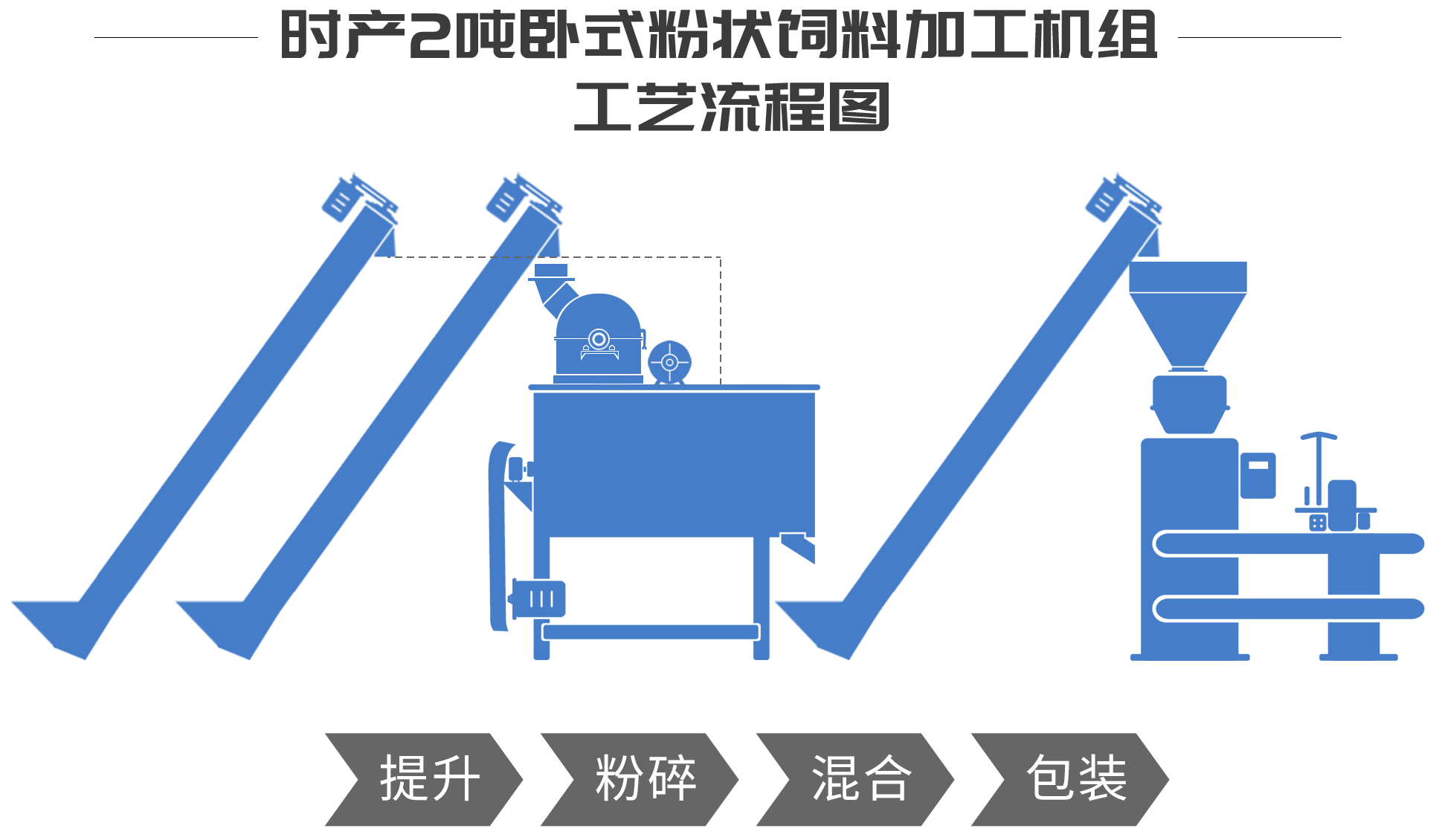 本套設備主要搭配有高效飼料粉碎機、單軸雙螺帶混合機、飼(sì)料定(dìng)量包裝(zhuāng)機、螺旋(xuán)提升機以及電控(kòng)櫃等。