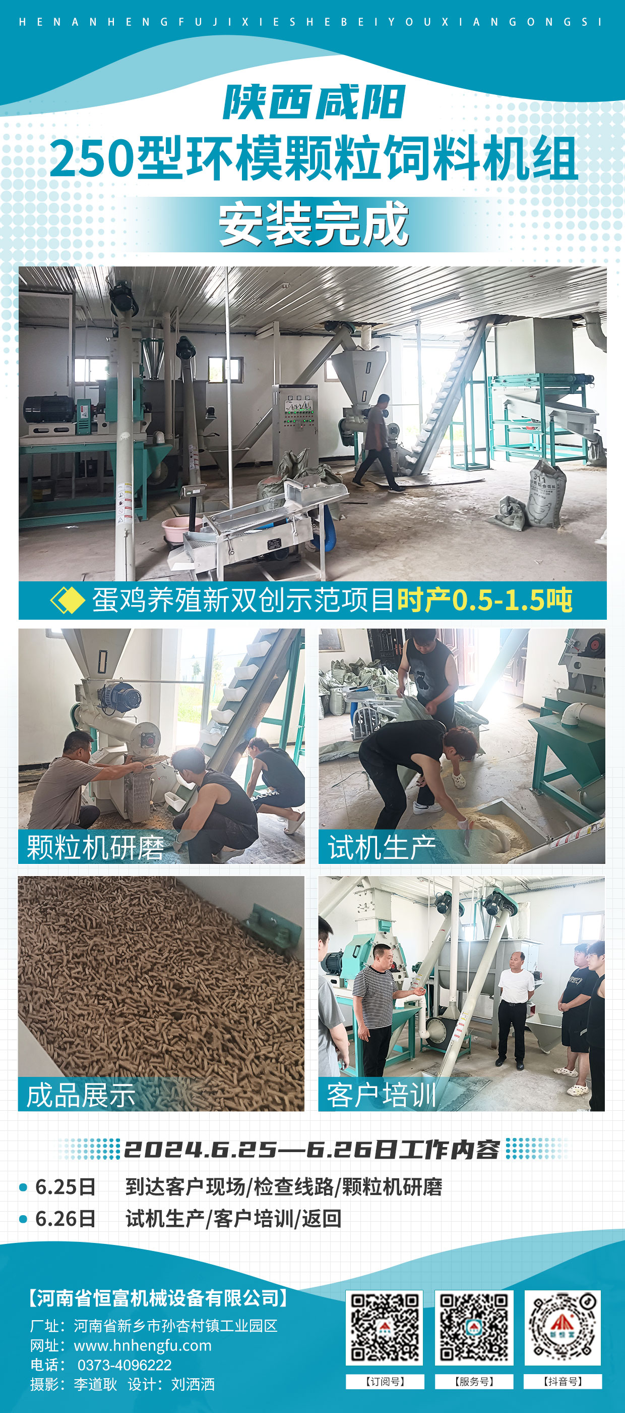 安裝完成的設備(bèi):陝西鹹陽250型環模顆(kē)粒飼料機組(zǔ)、河南鄭州66*60水滴(dī)型粉狀飼料機組。