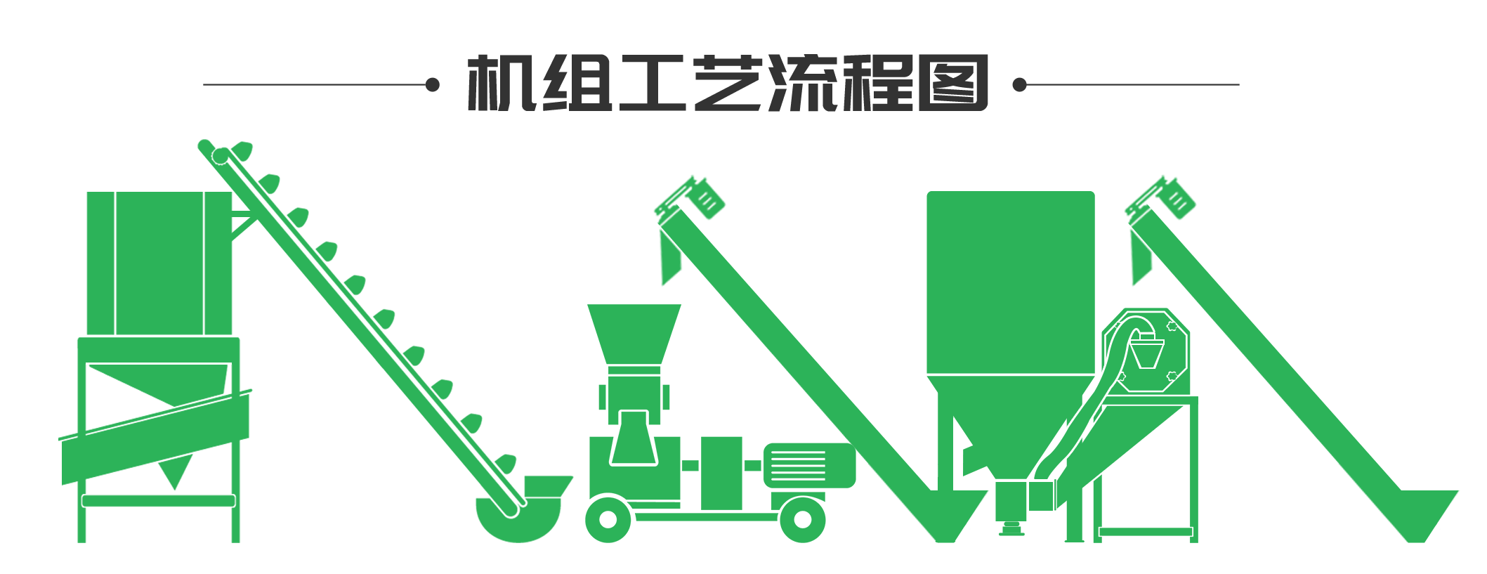 采用一體式飼料機粉碎混合物料;經螺旋提升(shēng)機提(tí)升至300型平模顆粒機製粒後;由刮鬥輸送機輸送到1m³冷卻器進(jìn)行降溫除濕;物料(liào)經振動掛篩,篩出粉(fěn)料和成形不(bú)好的顆粒重新製粒,從而提升成品顆粒飼料的品質;最後人工包裝或者搭配小推車(chē)直接飼喂。