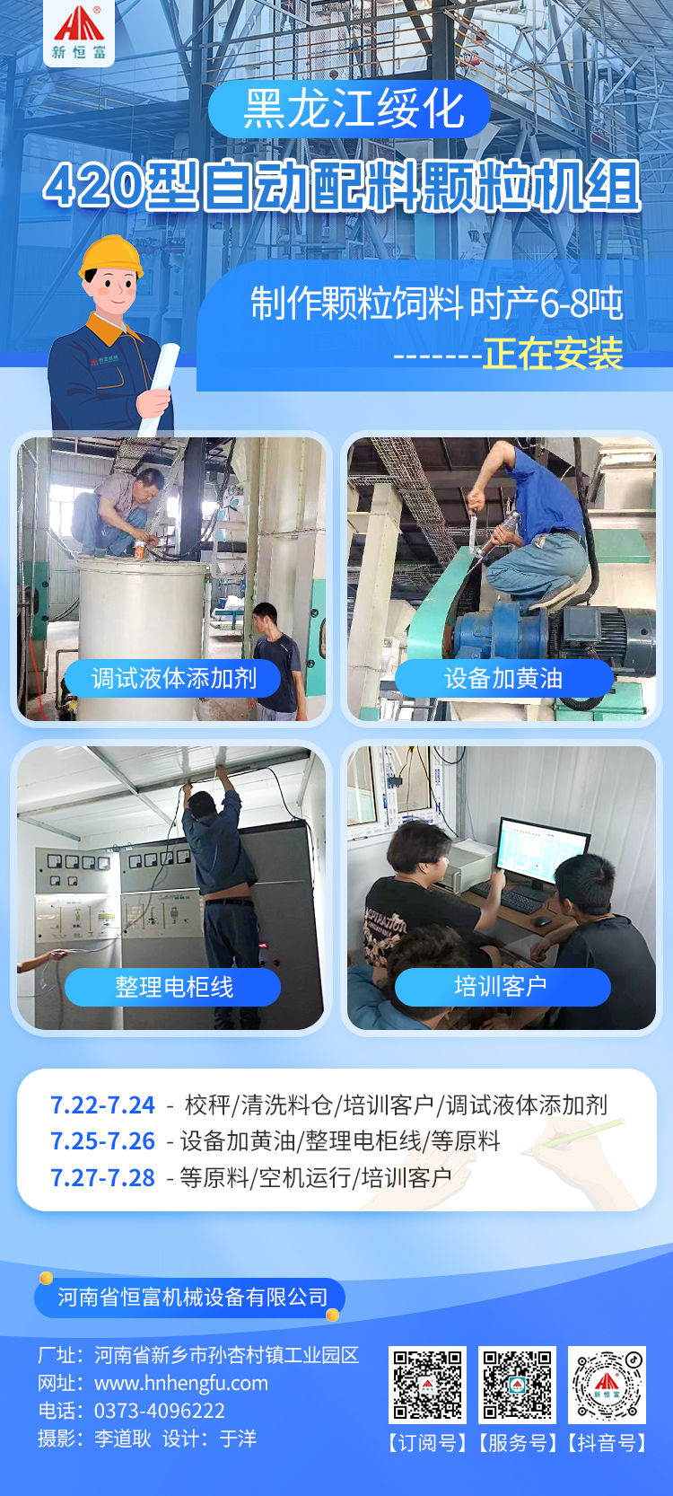 正在安裝的設備:黑龍江綏化420自(zì)動配料顆粒飼料(liào)機組、四川雅安250型顆粒飼(sì)料機組。