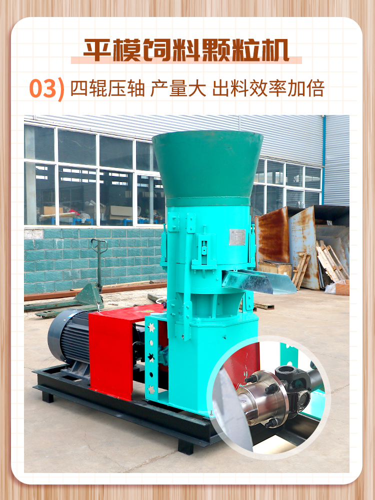 平模顆(kē)粒機適用於中小(xiǎo)型養殖場及小型飼料加工廠,可做各種類型顆粒飼料。結構簡單,操作方便,主要是性價比高。