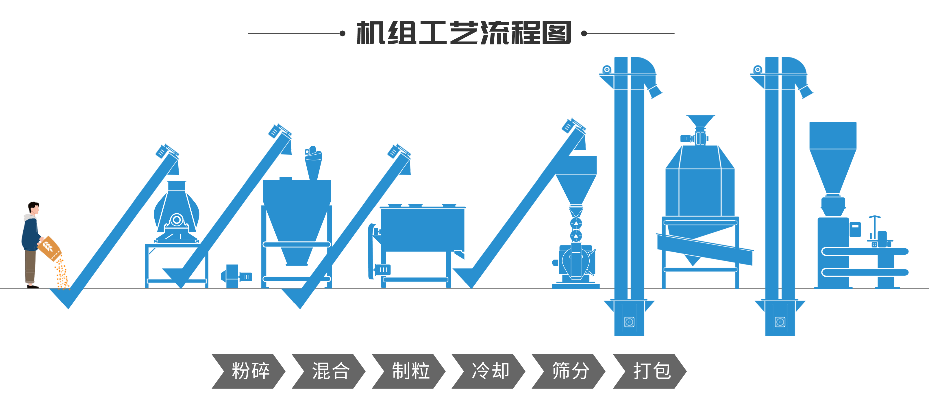 該飼料生產線是根據客戶需求在水滴型臥式粉狀飼料機組的基礎上增加了(le)製粒、冷卻、篩分、包(bāo)裝等一(yī)係列設備。整套設備投資不大,但日產量(liàng)可達30-50噸。