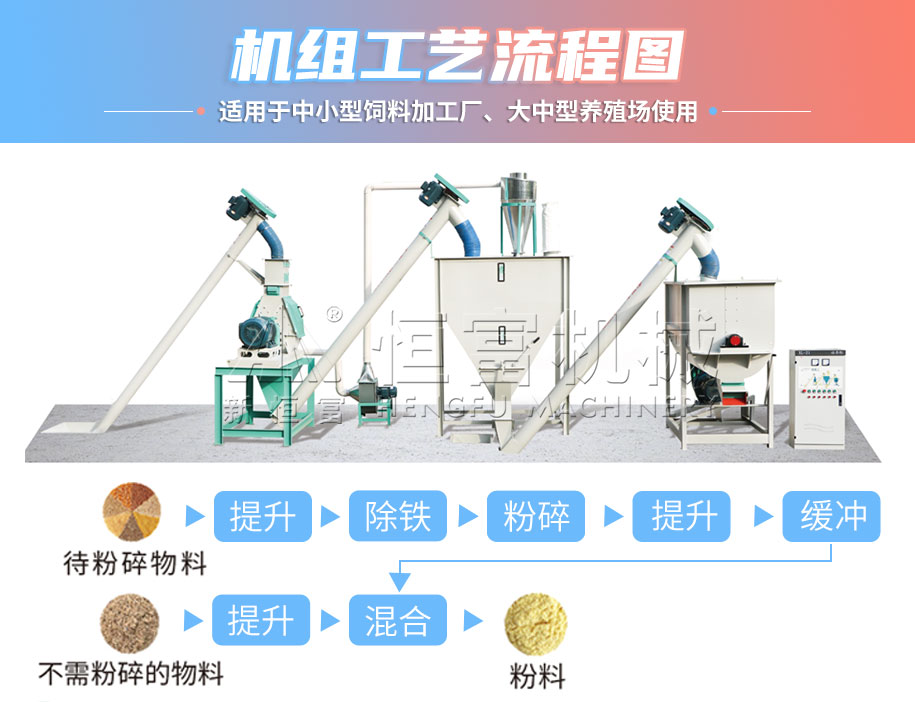 該機組配備的設備有:水滴式粉碎機、緩(huǎn)衝倉(cāng)、單軸雙螺旋混合機、提升輸送設備(bèi)、除(chú)塵除鐵設(shè)備、電控係統、注油係統、配件等。