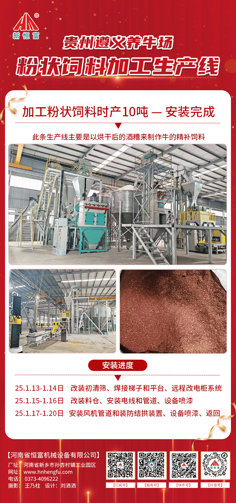 貴州遵義養牛場,時產10噸粉狀飼料加工生產(chǎn)線安裝(zhuāng)完成。