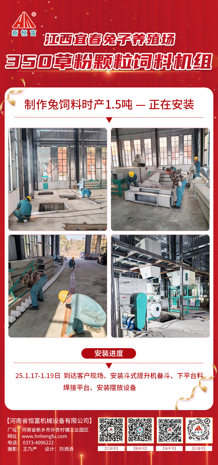 江西(xī)宜春兔子養殖場,時產1.5噸草粉顆粒(lì)飼料加工機組(zǔ)正在安裝。