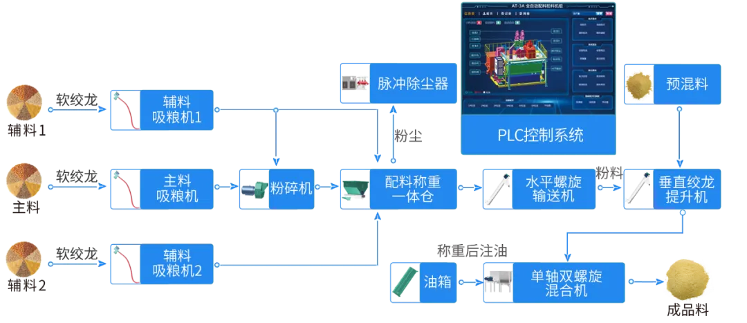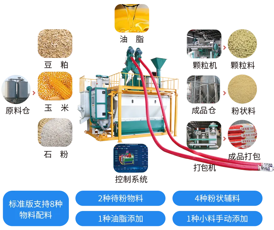 該搭配方式適用於各(gè)種規格的大、中型飼料廠和養殖場使用。配製的(de)飼料成分均勻,無需特定場所即可實現連續生(shēng)產,同時能夠生產預混料、混合料、濃縮料和全粉飼料等多種產品。