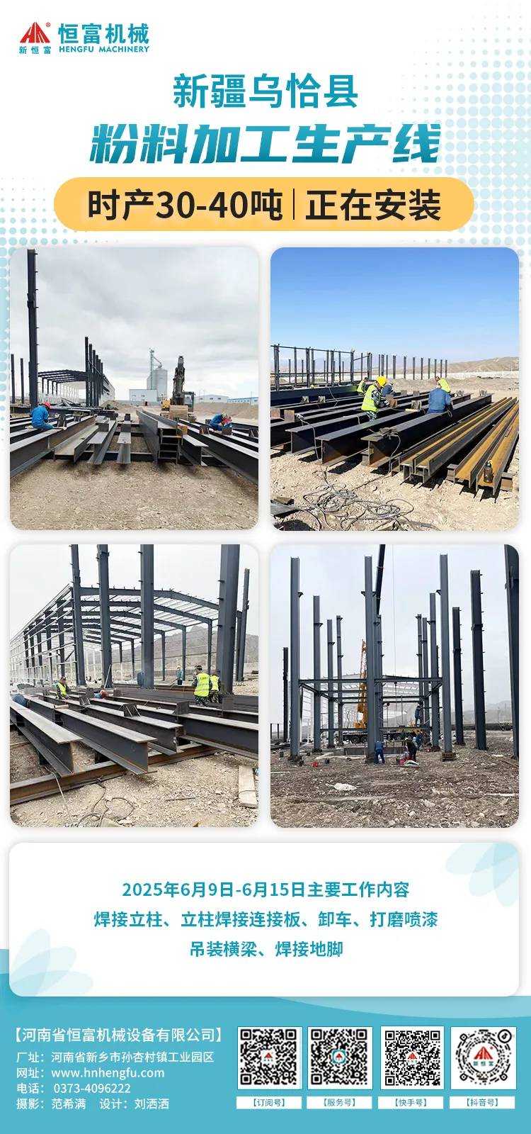 2025年6月9日(rì)至6月15日主要工作內容(róng):焊接平台,裝料倉(cāng)、井字架、氣動閘門,鋪鋼板,焊接護(hù)欄(lán)以及二層平台鋼(gāng)架、樓梯等。