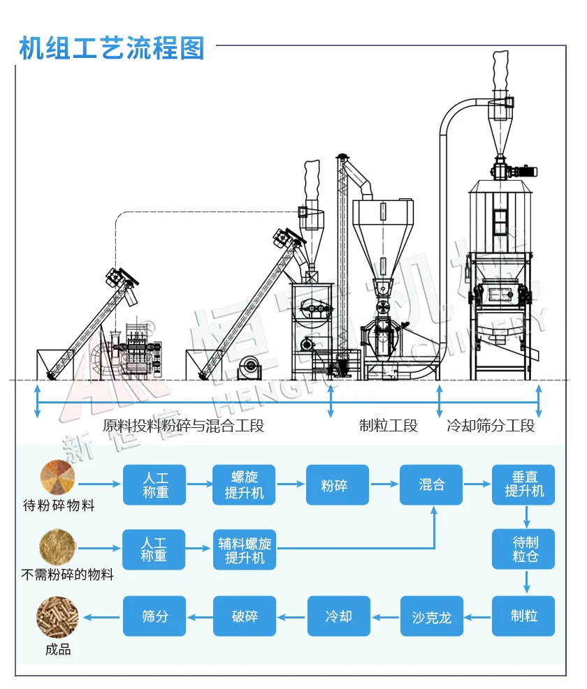 主要設備有:多功能飼料粉碎機、單軸雙螺旋飼料混合(hé)機、環模(mó)飼料顆粒機、逆流式飼料冷卻器、輥式飼料破碎機(jī)、PLC控製(zhì)係統、油液添加係統。