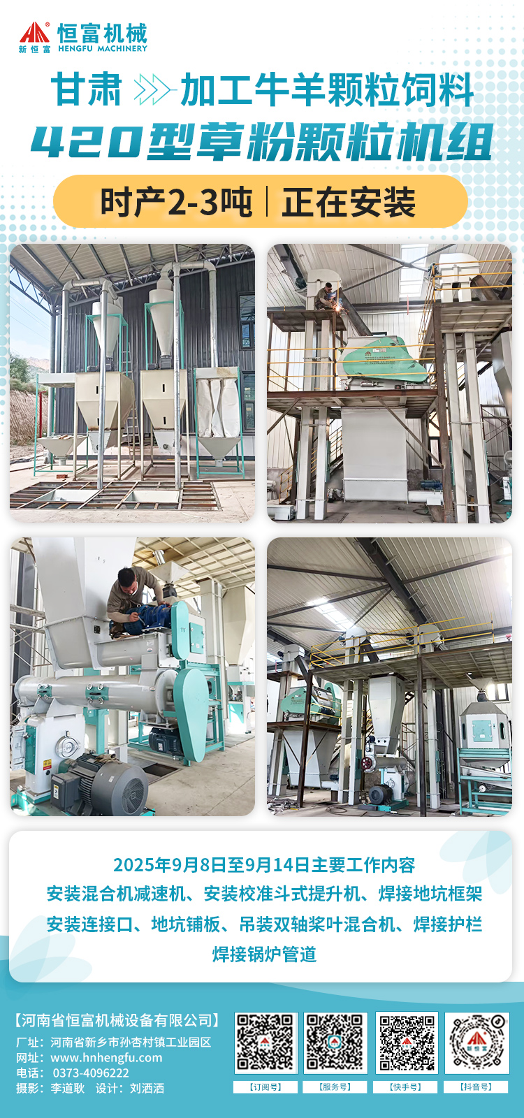 420 型草粉顆粒飼料機(jī)組正在安裝,客戶主營牛羊草粉飼料顆粒加工出售。